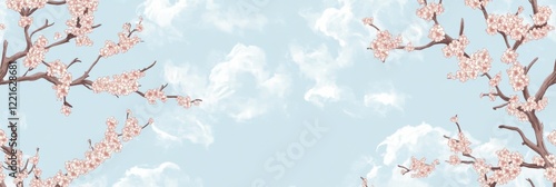 © sweet_mellow, Obraz premium Blossoming cherry branches against a cloudy sky capturing spring warmth