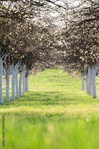 Obraz premium Blossoming cherry orchard in spring time
