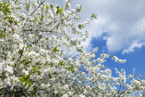 © eliosdnepr, Obraz premium Blossoming cherry tree with white flowers in spring