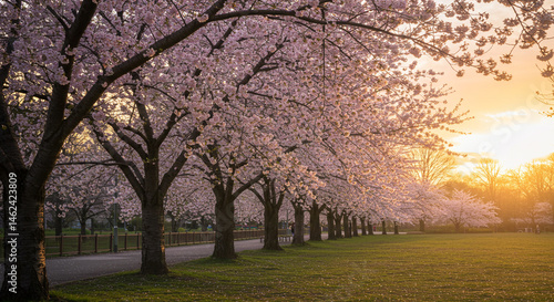 © marh.pan, Fototapeta premium Blossoming Cherry Trees at Sunset in a Serene Park Setting