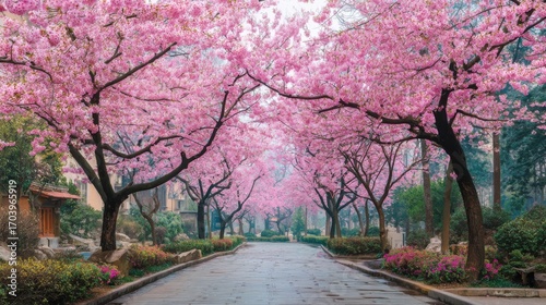 Naklejka premium Blossoming cherry trees create a stunning pink canopy over a peaceful...