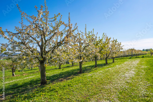 © fotografci, Fototapeta premium Blossoming cherry trees in Wiesbaden-Frauenstein/Germany in the Rheingau