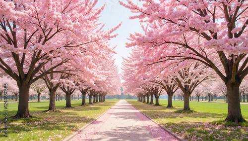Naklejka premium Blossoming cherry trees lining serene path, tranquil beauty, Cherry Blossom Tree, Cherry Blossoms