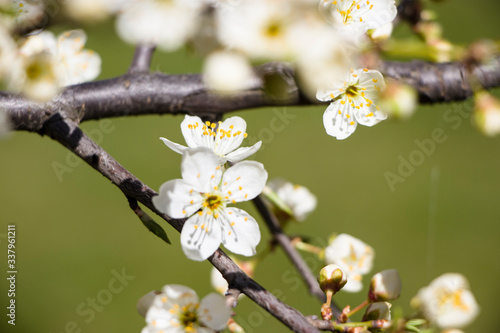 © Anoo, Obraz premium Blossoming cherry with a blurred background. Spring.