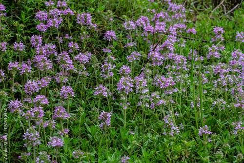 Naklejka premium Blossoming fragrant Thymus serpyllum, Breckland wild thyme, creeping thyme,...