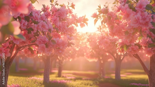 Naklejka premium Blossoming fruit trees in a sunny orchard, symbolizing abundance and new life.