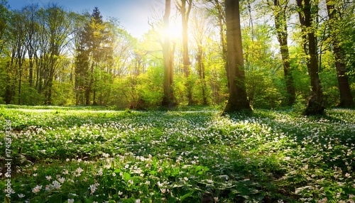 Obraz premium blossoming glade of flowers in green spring forest in sunlight
