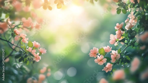 Fototapeta premium Blossoming jasmine flowers in soft focus beautiful floral background image, Delicate spring floral with warm sunlight and soft bokeh, Perfect for Themes of Nature, Renewal.