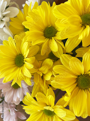 © VValD, Fototapeta premium Blossoming lush small yellow, white and pink chrysanthemums with green leaves, close-up, top view. Bouquet of chrysanthemums. Summer period. Flower shop. Present. Sign of attention.