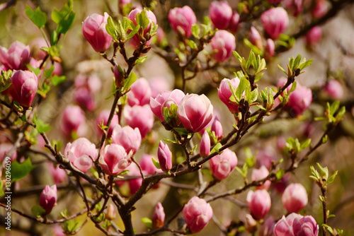 © Roxana, Fototapeta premium Blossoming of magnolia flowers in spring time, retro vintage hipster image