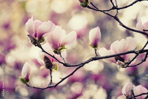 © Roxana, Fototapeta premium Blossoming of pink magnolia flowers in spring time, floral background