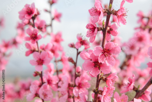 Fototapeta premium Blossoming peach tree branches, the background blurred. Spring concept