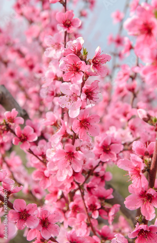 Fototapeta premium Blossoming peach tree branches, the background blurred. Spring concept