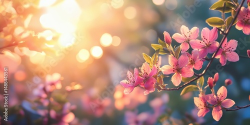 Fototapeta premium Blossoming pink flowers under golden sunlight in a serene spring garden...