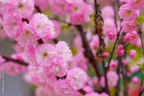 © Iurii Gagarin, Obraz premium Blossoming sakura tree flower with selective focus on blurred background. Defocused backdrop copy space