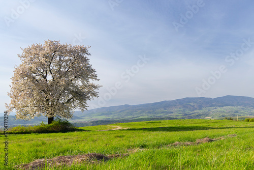 © Richard Semik, Obraz premium Blossoming tree standing in field with mountains in Budina, Slovakia
