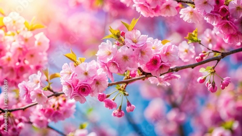Obraz premium Blossoming tree with vibrant pink cherry blossoms in bloom , Spring, nature,...