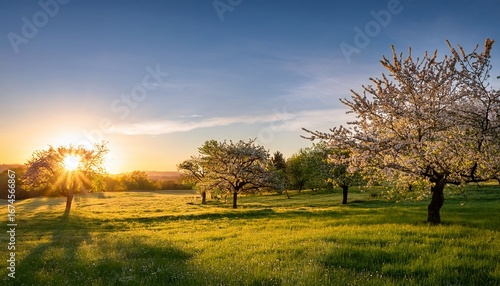 Obraz premium blossoming trees at sunrise with sunlight filtering through and illuminating a grassy field