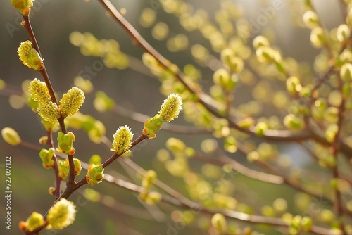 Fototapeta premium Blossoming willow branches with catkins on blurred background. Branches in...