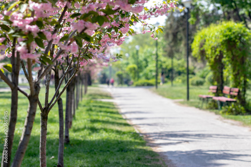 Naklejka premium Blossoming young sakura trees pathway in a beautiful landscape park