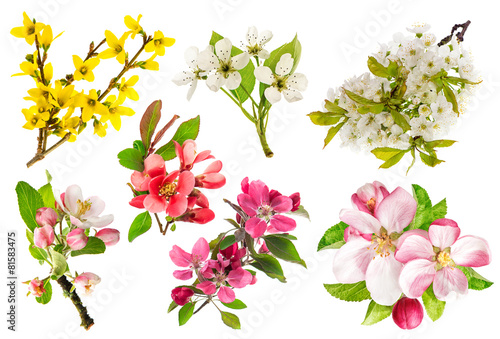 Fototapeta premium Blossoms of apple tree, cherry twig, forsythia. Set of spring fl