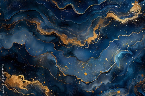 Fototapeta premium Blue abstract marble with gold veins natural background. Closeup of granite...
