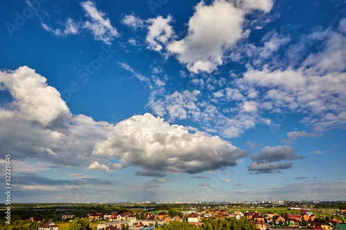 © Maksim, Fototapeta premium Blue aerial landscape on light background. Empty background scene. Panoramic view. Sky blue background. Urban scene. Sunny day, blue sky. Wide angle. Wide panorama. Aerial view. Sky clouds.