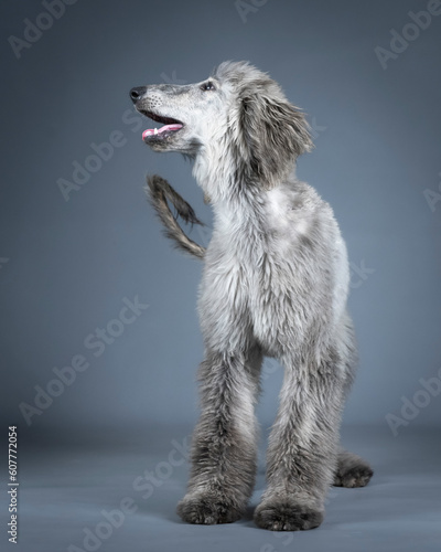 © xyo33, Fototapeta premium Blue Afghan hound puppy standing in a photography studio