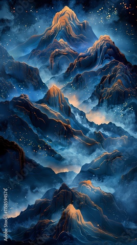 © jinzhen, Naklejka premium Blue and gold traditional ink landscape painting poster background