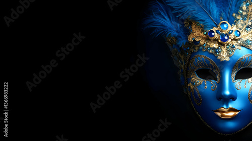 © Kamran, Naklejka premium Blue And Gold Venetian Mask Illustration With Feathers On Black Background
