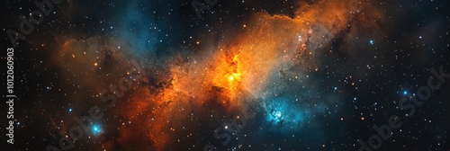 Naklejka premium Blue and Orange Cosmic Scene with Mysterious Stars and Nebulae