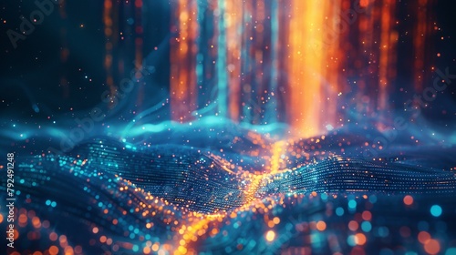 Obraz premium Blue and orange glowing particles form a digital landscape, represent data stream