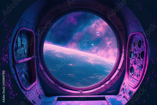 Obraz premium blue and pink inside of this grunge spaceship with a view of the outer planets. Generative AI