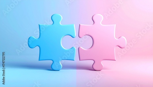 Obraz premium Blue and pink jigsaw puzzle pieces interlocking on gradient background,...