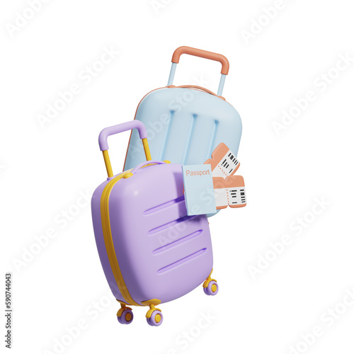 Obraz premium Blue and purple cartoon baggage with tickets on white empty background