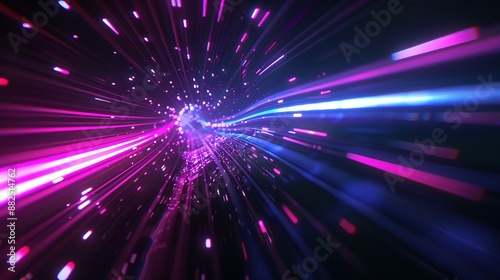 © Rachele, Obraz premium Blue and Purple Light Lines on Dark Background: 3D Hyperspace Visualization