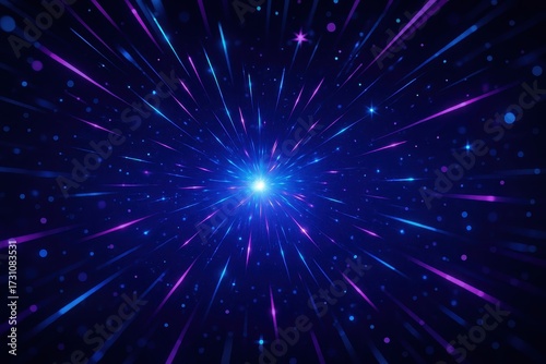 Naklejka premium Blue and purple neon light trails exploding through deep space cosmic party backdrop