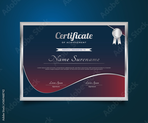 Fototapeta premium Blue and Red Certificate Template with Silver Badge