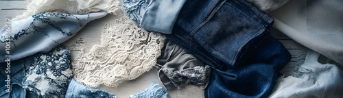Fototapeta premium Blue and White Fabric Textures on White Wood