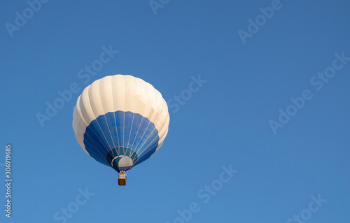 Fototapeta premium Blue and white hot air balloon flying in blue sky