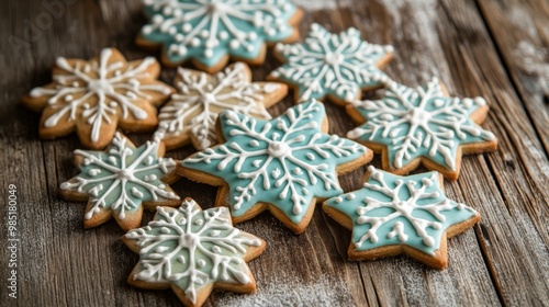 Fototapeta premium Blue and White Snowflake Star-Shaped Cookies on Wooden Surface