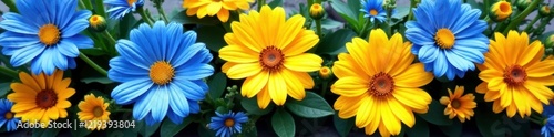 Fototapeta premium Blue and yellow flower arrangement with mixed colors, blooms, colors, mix