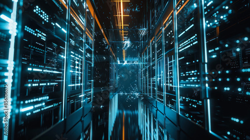 Fototapeta premium Blue and yellow lights in data center aisle