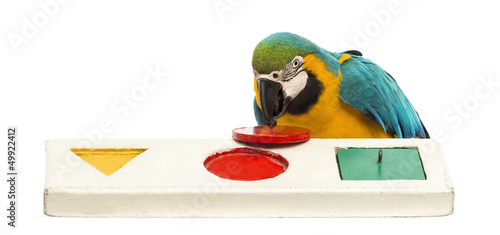 Obraz premium Blue-and-yellow Macaw, Ara ararauna, 30 years old, playing