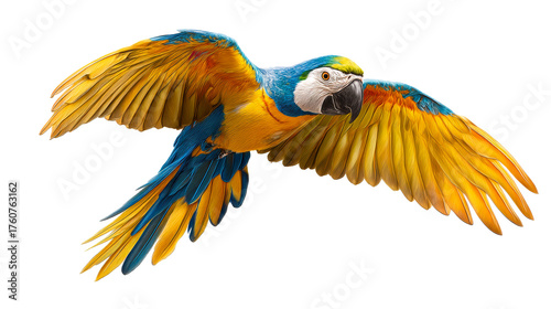 © Maestro, Fototapeta premium Blue and yellow macaw bird in flight with wings spread, cut out transparent