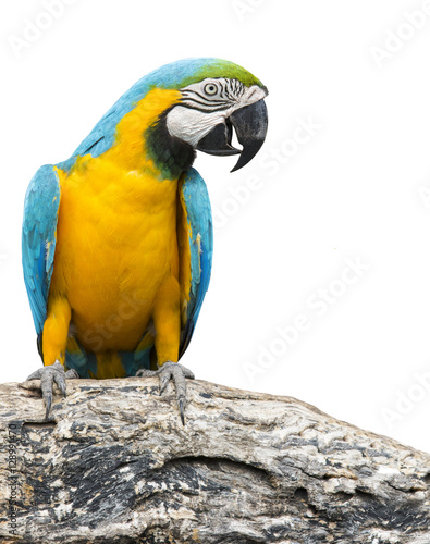 Fototapeta premium blue and yellow macaw bird perching on tree branch isolate white