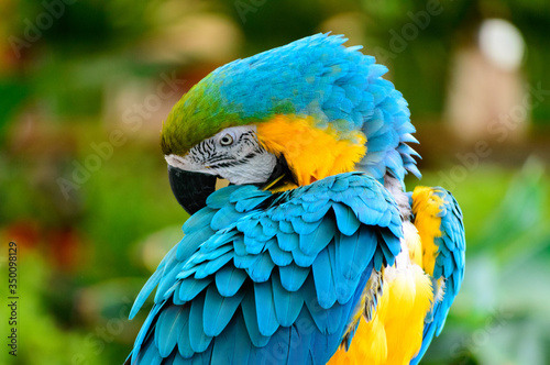 © eugpng, Obraz premium Blue and yellow macaw parrot arranging its colorful feathers