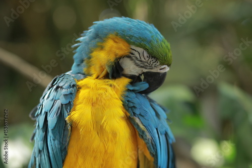 © Юрий Несмашный, Fototapeta premium Blue-and-Yellow Macaw Perched on Branch Amid Tropical Greenery