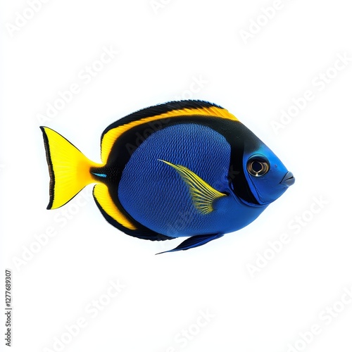 Naklejka premium Blue Angelfish on White Background - Vibrant blue angelfish isolated on a white background, symbolizing aquatic life, tropical beauty, ocean wildlife, marine biodiversity, and underwater serenity
