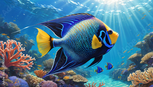 Naklejka premium Blue Angelfish Swimming in Coral Reef